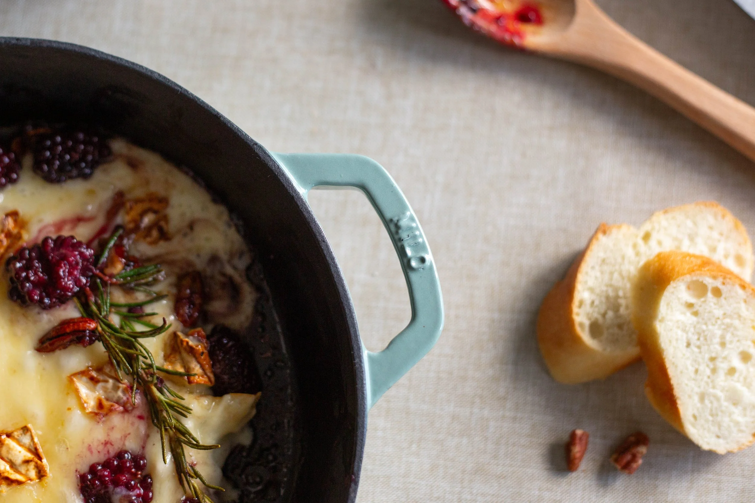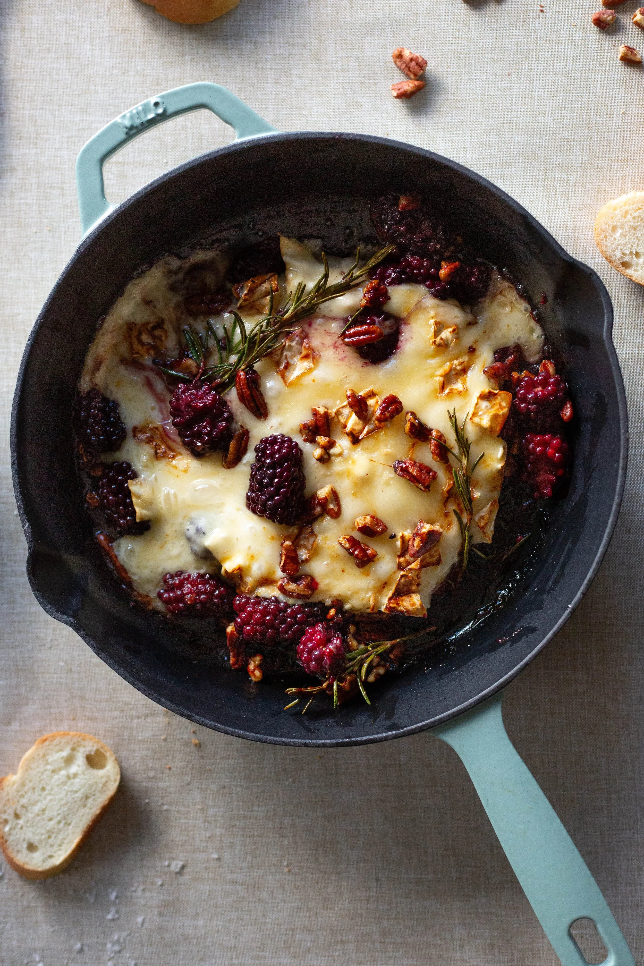 - Remove and add the pecans, blackberries, rosemary, and another small drizzle of honey. Sauté for a couple minutes and then add back the brie, scored side up.