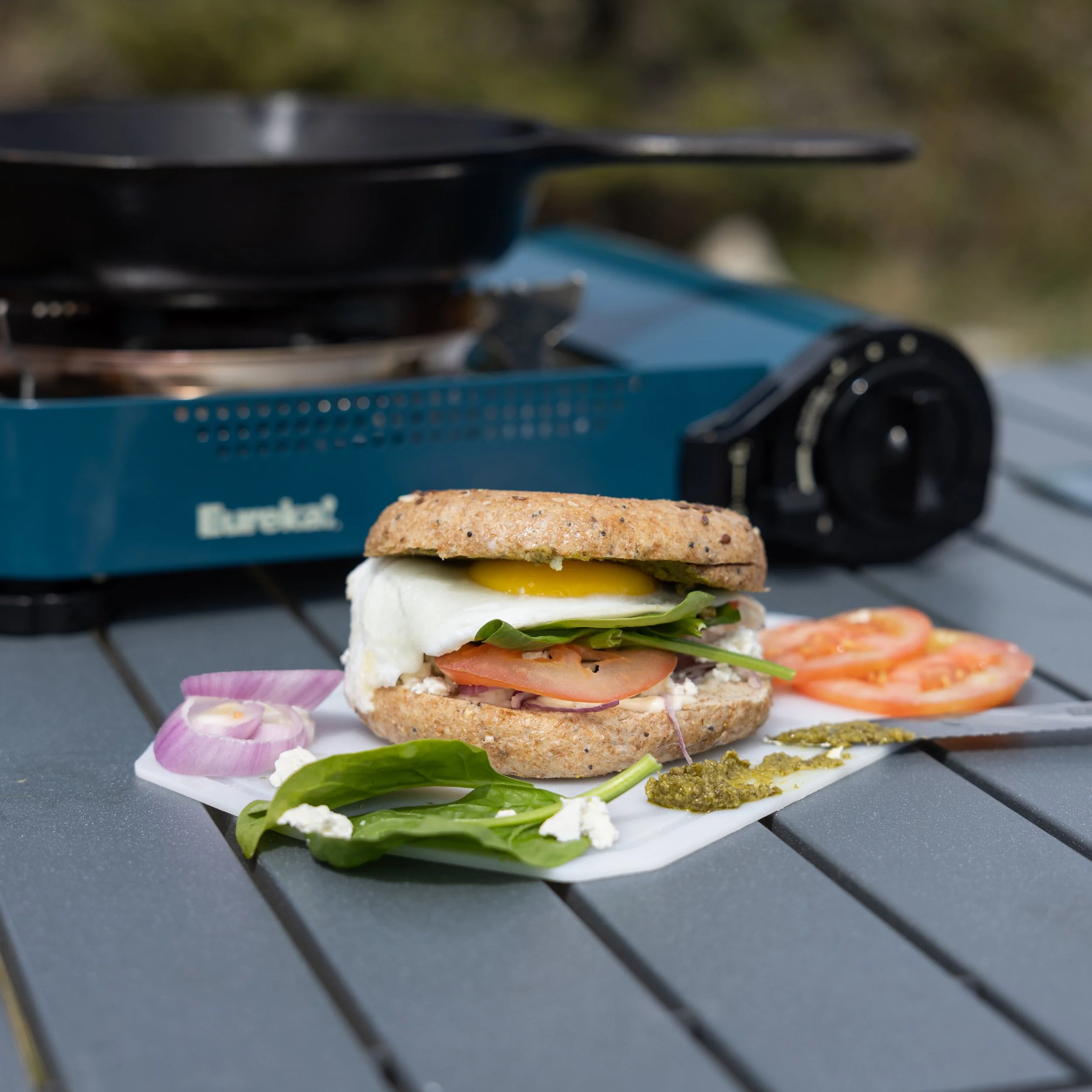 Try this delicious bagel breakfast sandwich next time you’re out camping! Filled with basil pesto, feta, fresh veggies, and a perfectly runny egg, this meal is perfect for a fresh, easy start to your day!